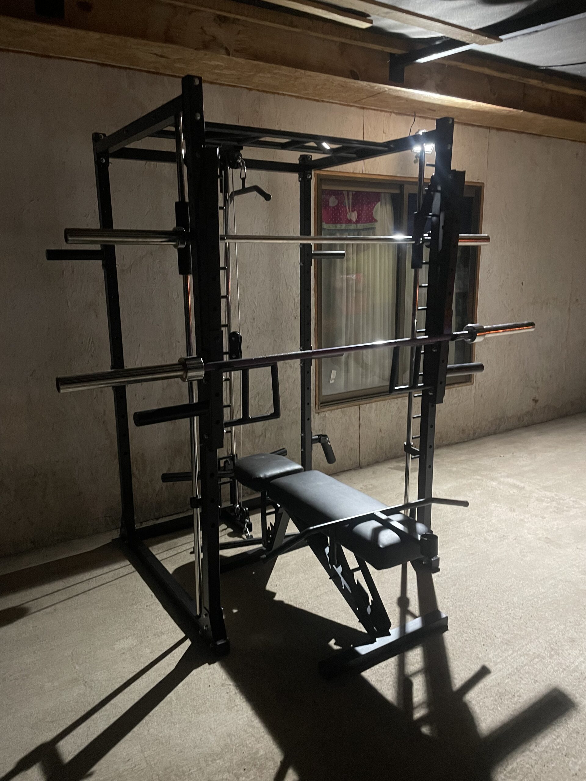 incluye : poleas alta y baja con garre recto y tipo remo, sistema Smith con rodamientos lineales y de polines, incluye barra Olimpica anclada en smith, brazos articulados (jammer arms) landmine con rodamiento, escalerilla multigrip , soportes para discos, revestida en pintura electroestática al horno en color a elección más Banco con niveles alto tráfico (valor normal 175.000) + barra Olimpica adicional a la que ya trae el sistema Smith para practicar pesos libres