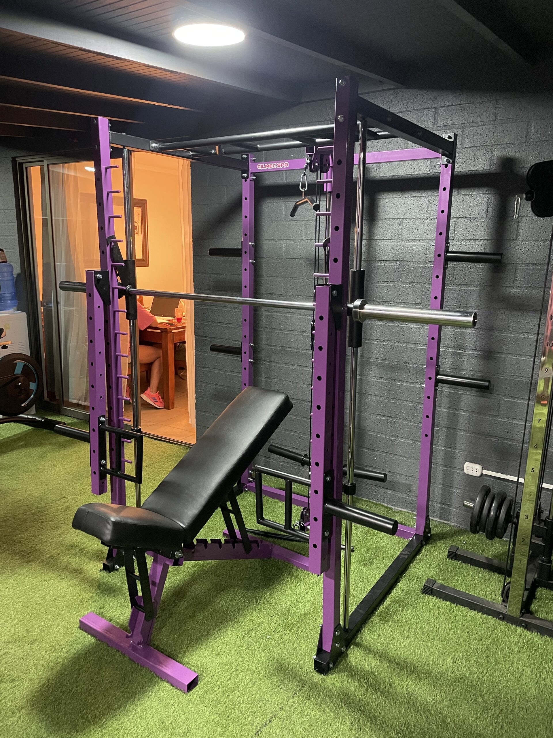 incluye : poleas alta y baja con garre recto y tipo remo, sistema Smith con rodamientos lineales y de polines, incluye barra Olimpica anclada en smith, brazos articulados (jammer arms) landmine con rodamiento, escalerilla multigrip , soportes para discos, revestida en pintura electroestática al horno en color a elección más Banco con niveles alto tráfico (valor normal 175.000)