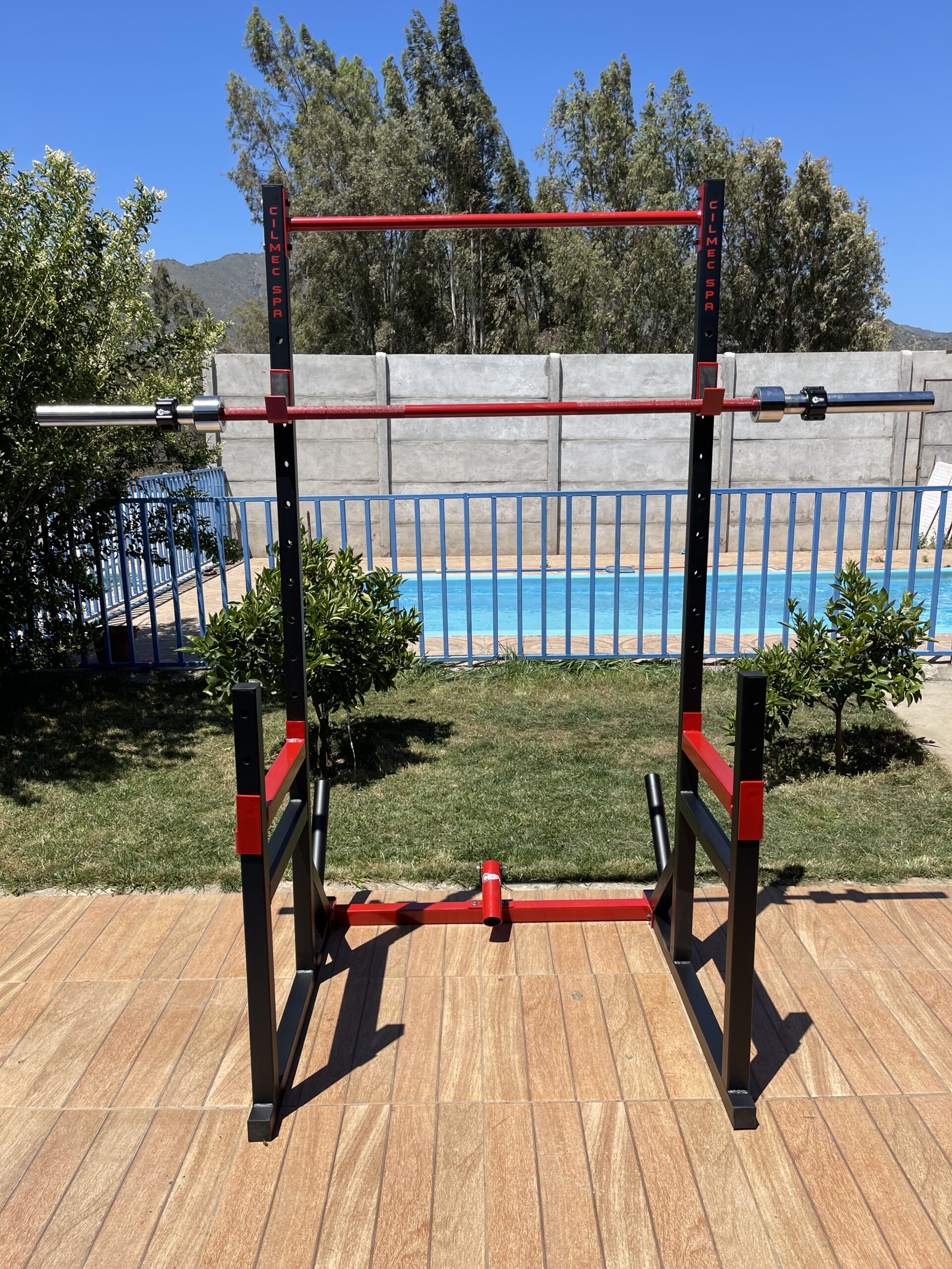 Media jaula fabricada en perfil de 50mm, incluye landmine con rodamiento lo que permite giro a 180 y 360 grados, j cup, soportes de seguridad, 12 niveles, soportes de discos olimpicos mas barra olimpica 20kg color a eleccion y collarines