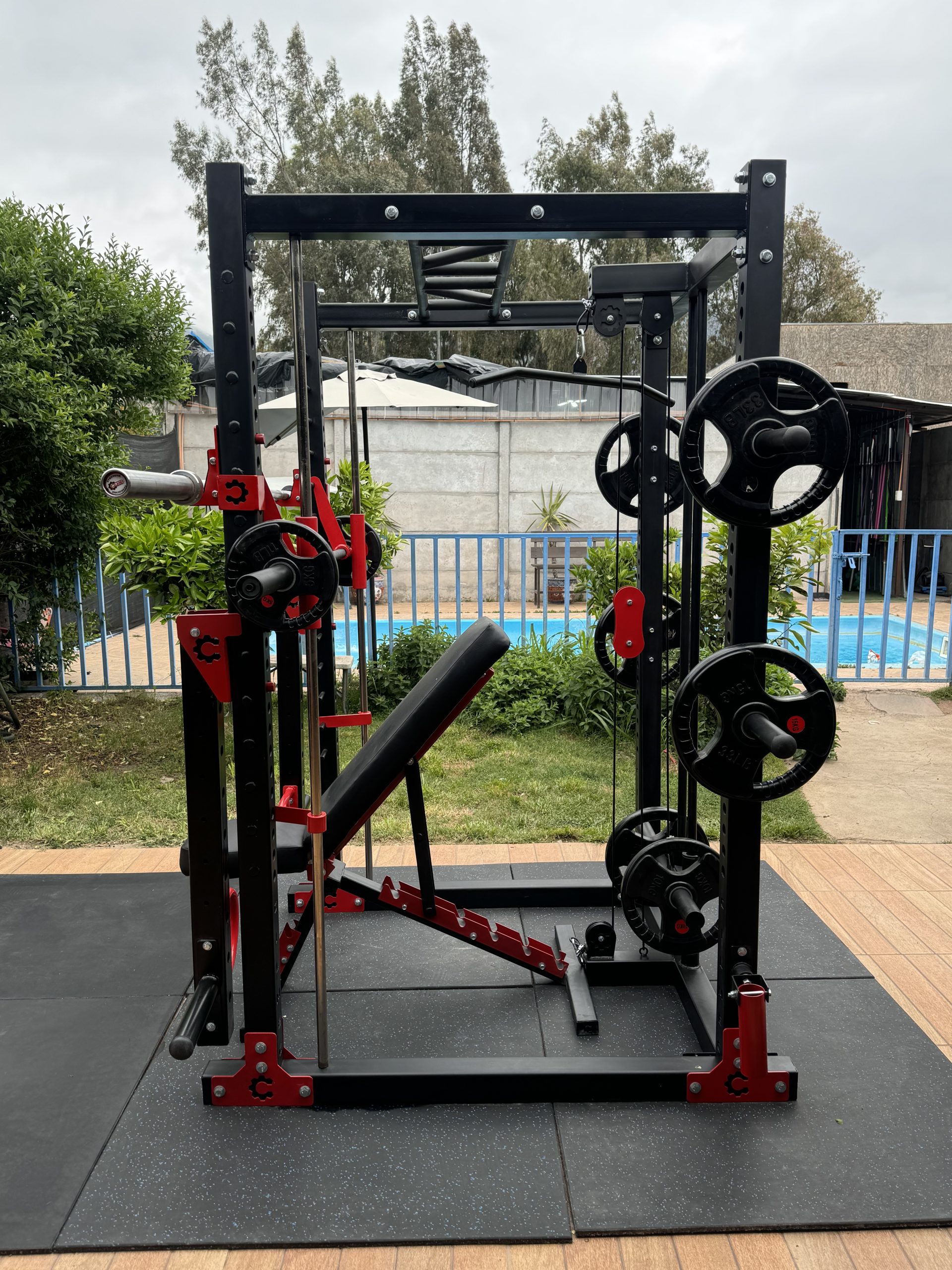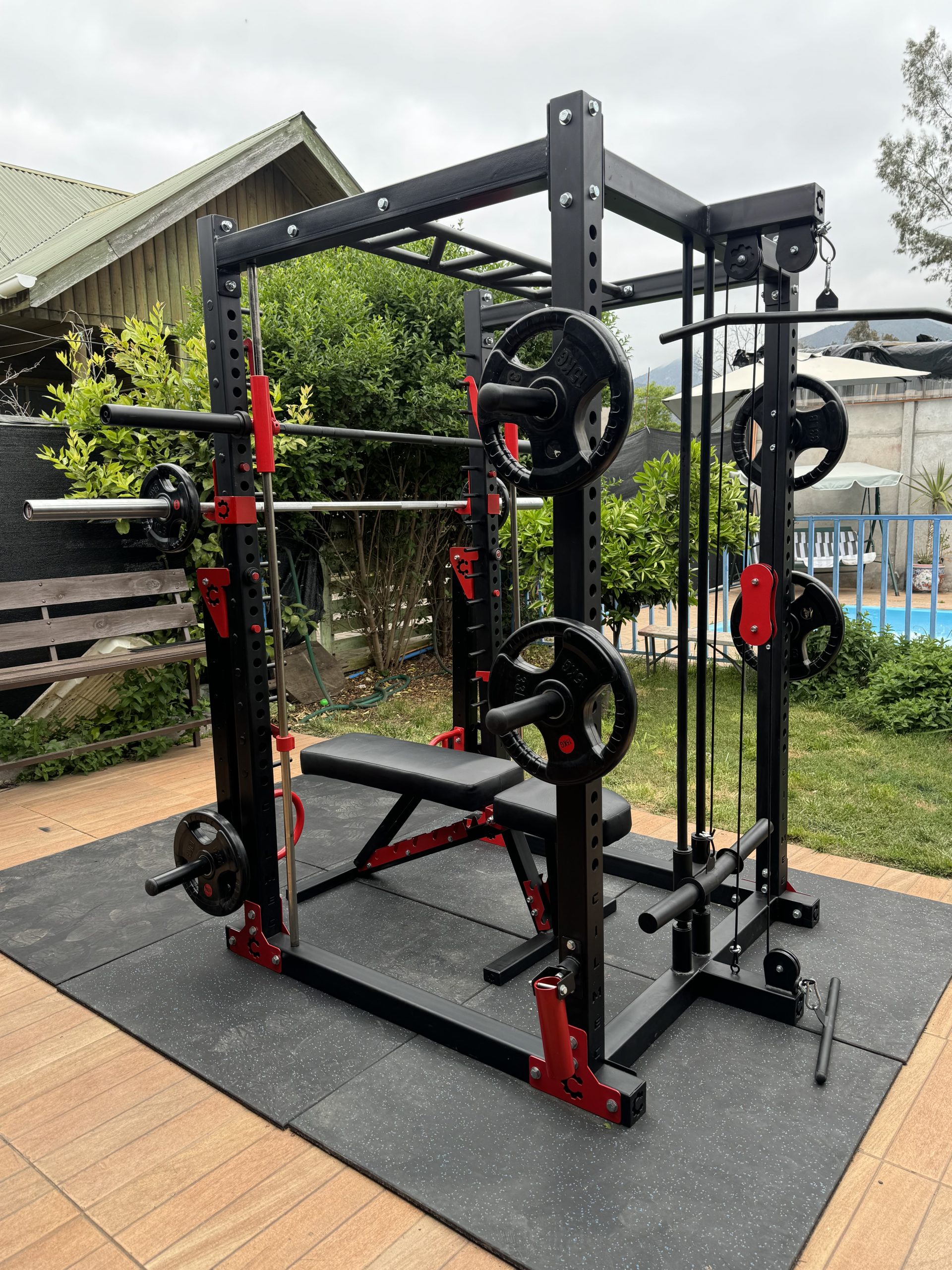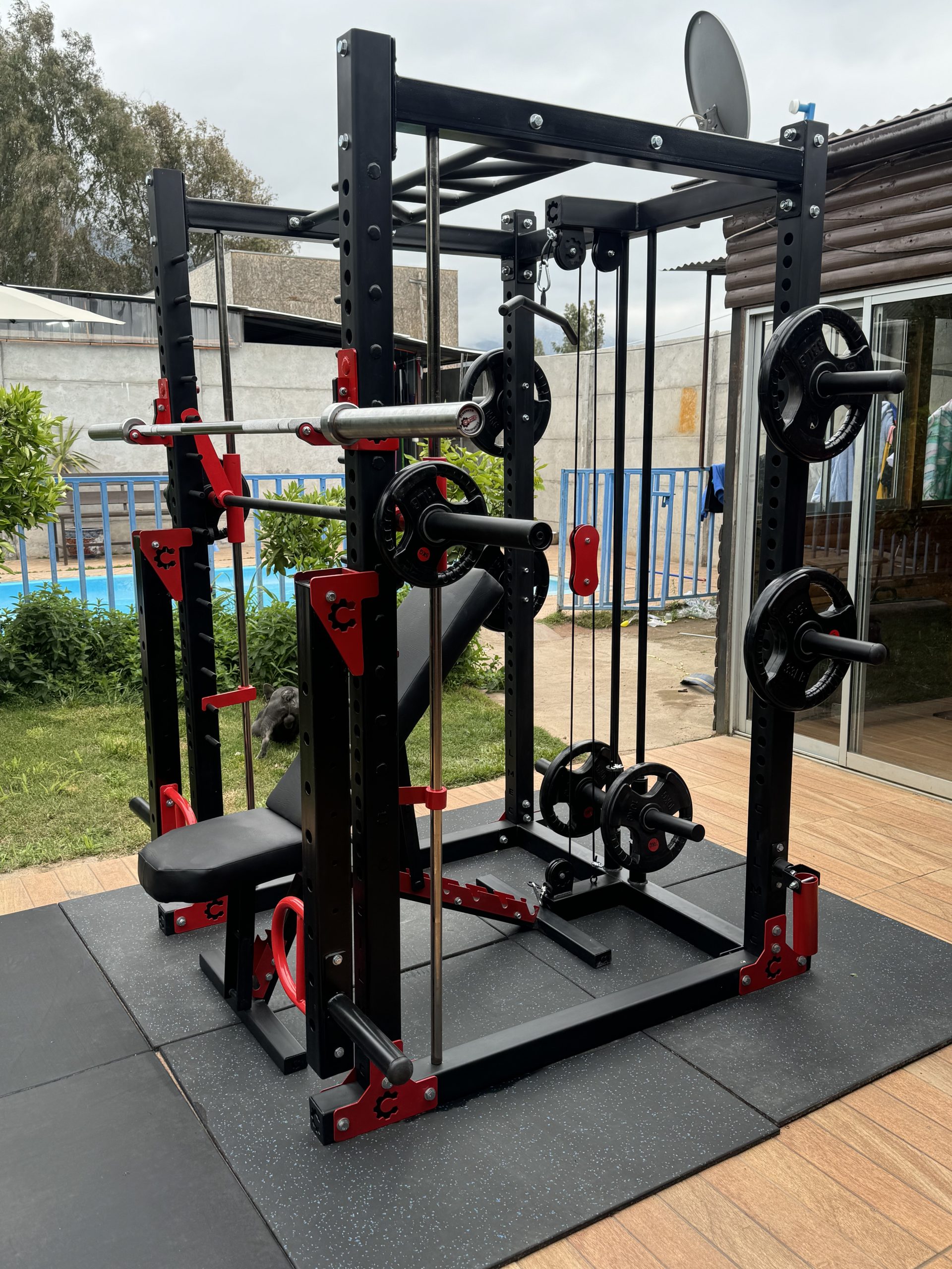 incluye : poleas alta y baja con garre recto y tipo remo, sistema Smith con rodamientos lineales y de polines, incluye barra Olimpica anclada en smith, brazos articulados (jammer arms) landmine con rodamiento, escalerilla multigrip , soportes para discos, revestida en pintura electroestática al horno en color a elección más Banco con niveles alto tráfico + barra Olimpica + 100kg en discos olímpicos